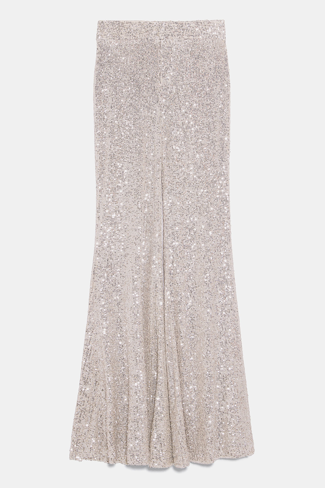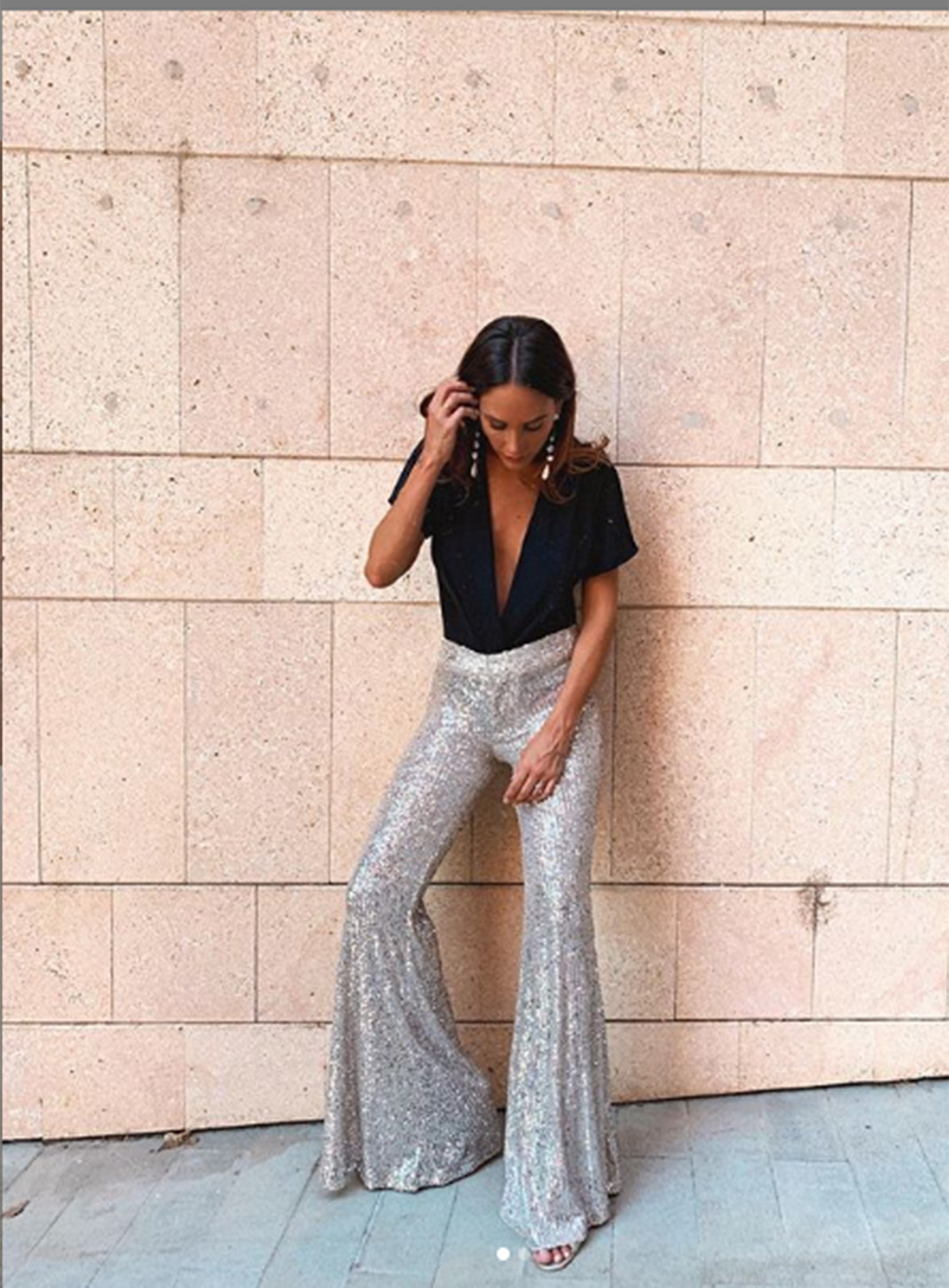Y es que la diseñadora sevillana ha apostado por uno de los pantalones más atrevidos de la temporada. Se trata de un diseño flare (bajo acabado en evasé) repleto de lentejuelas plateadas que solo es apto para aquellas que no les importe la llamar la atención. Un pantalón de Zara que cuesta 49,95 € (es de nueva temporada, chicas).